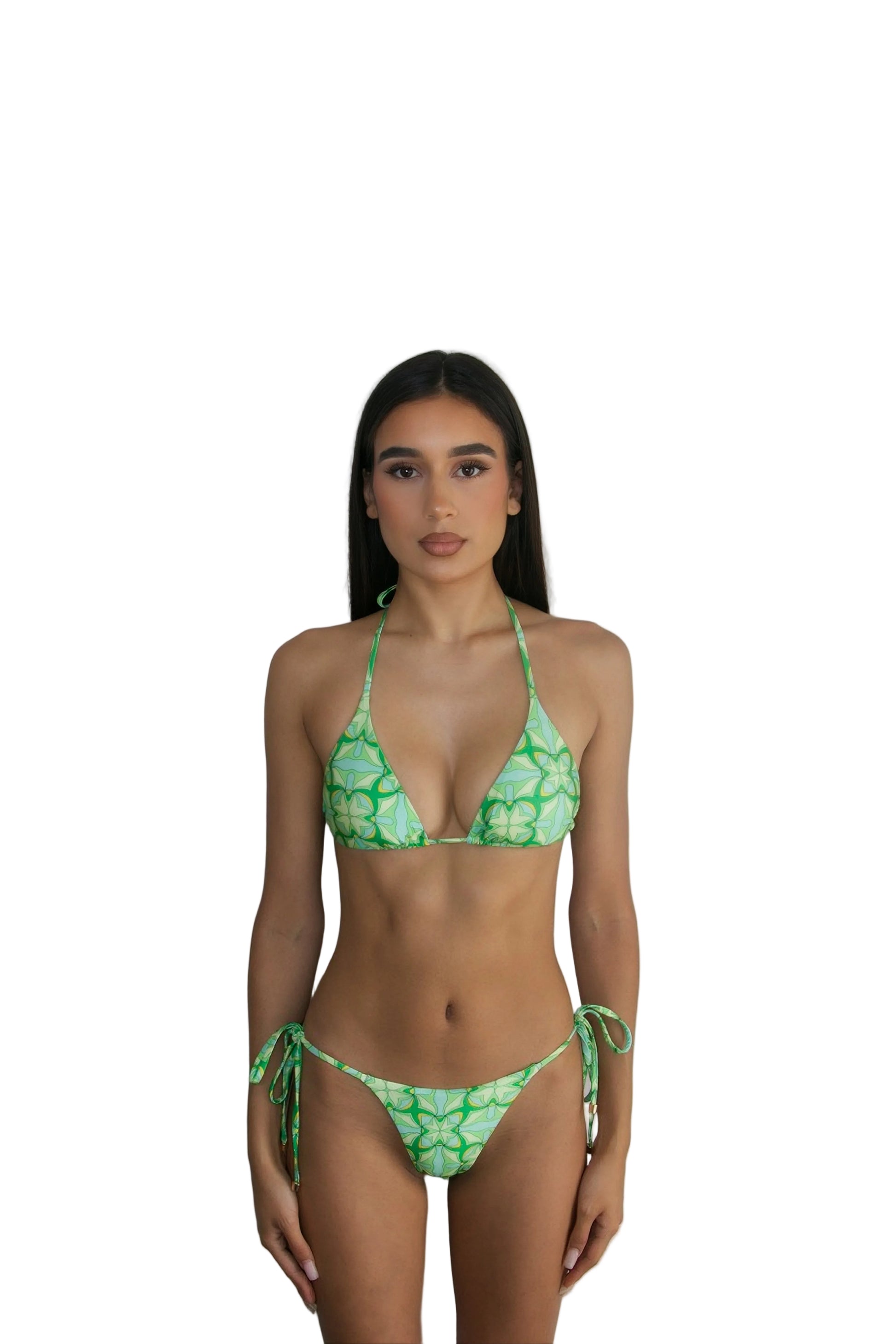 A cheeky cut designed to flatter, finished in a vibrant green, turquoise and marigold print.